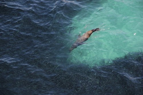 Humanos, tiburones y leones marinos fueron a investigar y «festejar» esta aparición. la temperatura del agua era casi de 24 grados centígrados.