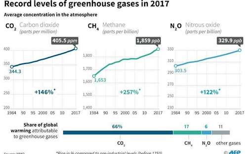 “El documento habla asimismo de que la presencia de los principales gases invernadero -el dióxido de carbono, el metano y el óxido nitroso- ha alcanzado nuevos máximos. En el caso del dióxido de carbono sigue aumentando un 1 % cada año, alcanzando un 2 % en 2018, y pese al extraordinario crecimiento de la energía renovable, los combustibles fósiles siguen dominando el sistema energético global.”