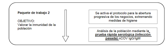 Realización de la prueba rápida serológica (nCOV IgG/IgM) por sangre capilar (pinchazo en el dedo de la mano) con tal de determinar el estado de inmunidad de la población. Se miden los anticuerpos IgM indicativos de una infección pasada reciente (7-14 días) y las IgG, que revelan una infección pasada de más de 14 días (véase figura 1).