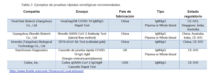 El listado completo se puede encontrar en el enlace https://www.finddx.org/covid-19/sarscov2-eval-immuno/. El listado de pruebas recomendadas puede variar a medida que salgan resultados de las evaluaciones.