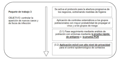 Aplicación de sensores de temperatura corporal (>37.5) y cuestionario de síntomas (1 de 4, tos, ahogo, dolor al tragar, fatiga) en los puntos de acceso de cualquier centro que reúna un determinado número de personas. Si alguien es positivo se le recomendará que se haga una prueba en el punto de diagnóstico más cercano.