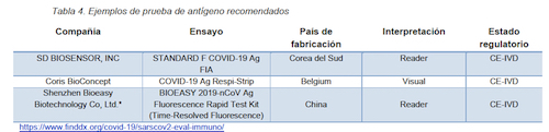 A fin de poder utilizar la prueba rápida de antígeno, se han comenzado a evaluar de forma independiente el rendimiento de las pruebas en desarrollo. La única prueba que se ha evaluado de forma independiente es BIOEASY-Reader (n 127, Chile): Sensibilidad 94% (IC95% 87-97), Especificidad 100% (92-100) Otros test recomendados están en el listado de https://www.finddx.org/covid-19/dx-data/