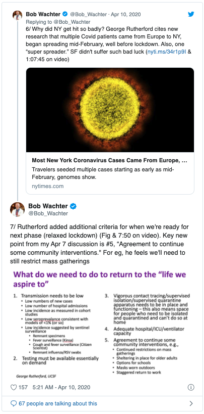 Tweet de Bob Wachter, del sistema de Salud de UCSF, uno de los mejores del mundo, que muestra el enorme aumento en las visitas de video de atención médica que han recibido desde el comienzo de la epidemia de coronavirus. Más de la mitad de sus visitas son ahora remotas.