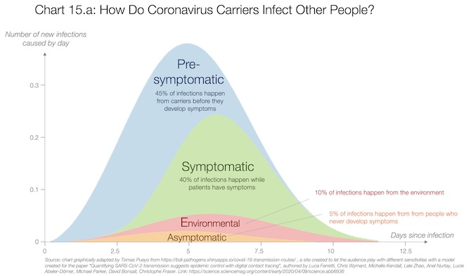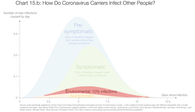 Un gran artículo de la Universidad de Oxford publicado en Science detalla una gran número de experimentos realizados para conocer cómo se propaga el coronavirus de persona a persona. El eje horizontal muestra los días desde la primera infección, y el eje vertical muestra cuántas personas se infectand de diferentes maneras en un día determinado. Por ejemplo, el día 5 después del contagio, los portadores infectan un promedio de personas cercano a 0.4 . La mayor parte proviene directamente de personas que ya son sintomáticas o que pronto lo serán (por lo que se llaman pre-sintomáticas). Una pequeña parte es a través del medio ambiente (probablemente superficies), y la menor proporción proviene de personas que tienen el virus pero que nunca desarrollarán síntomas.