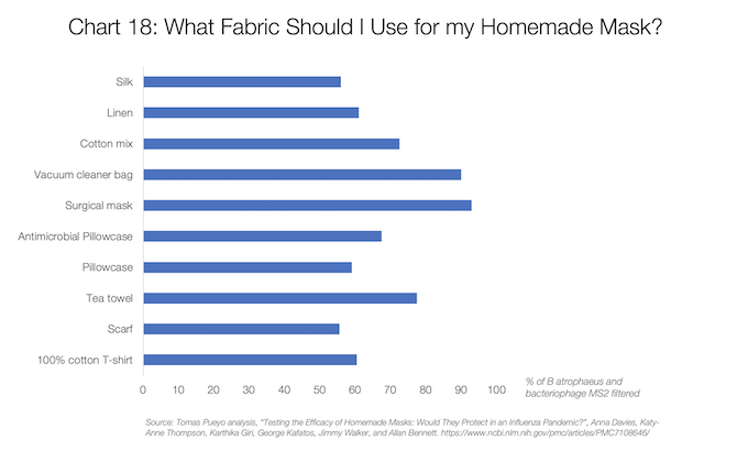 Algunas telas son mejores que otras, pero muchas son geniales. Como regla general, cuanto menos deja pasar una tela la luz, mejor. Sin embargo, también tienes que poder respirar. Listo para hacer tu mascarilla? Aquí hay una manera de hacer una en 40 segundoso una más completa.