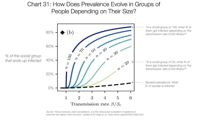 Sigamos la línea verde que dice n = 20, que representa un grupo con 20 personas. Esta línea muestra que, a medida que aumenta la tasa de transmisión de un virus, también lo hace la proporción de individuos en el grupo que se infectan. Y lo hace más rápido que la población normal (la línea de puntos inferior). Sin embargo, un grupo de 100 personas la mayoría de ellas contraerá la infección, incluso con una baja tasa de infección.
