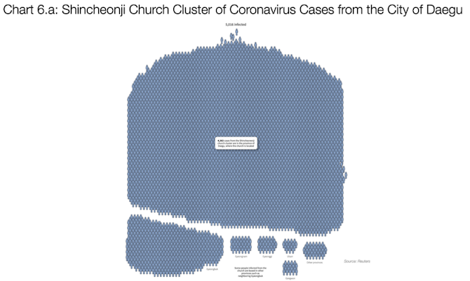 Una sola persona, el paciente 31, causó más de 5,000 casos. En ese momento fueron la gran mayoría de los casos en Corea del Sur. A mediados de mayo, esta cifra todavía representa más del 40% de los casos en el país, sin contar toda la propagación que podría haber surgido desde entonces. Si esta persona no hubiera causado este brote, tal vez Corea del Sur nunca hubiera tenido uno, como Taiwán.