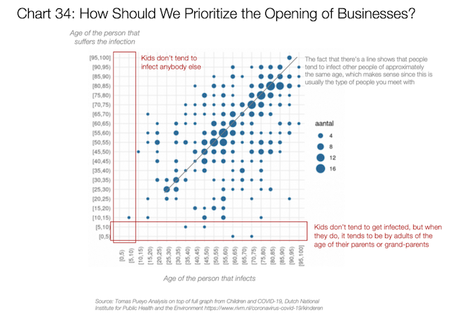 - Comience con niños pequeños, abriendo guarderías, pre-infántiles, guarderías y escuelas primarias. Estos niños están aprendiendo más, son los menos afectados por el coronavirus, sus padres obtienen el mayor alivio al poder trabajar y su edad es primordial para reducir la desigualdad a través del aprendizaje y la nutrición (nota: conflicto de intereses. Tengo tres niños pequeños)