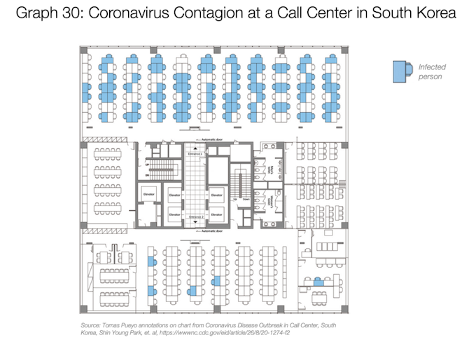 Y no se limita al trabajo manual. Un trabajador de un centro de llamadas infectó a unos 100 compañeros de trabajo (~ 45%) en Corea del Sur.