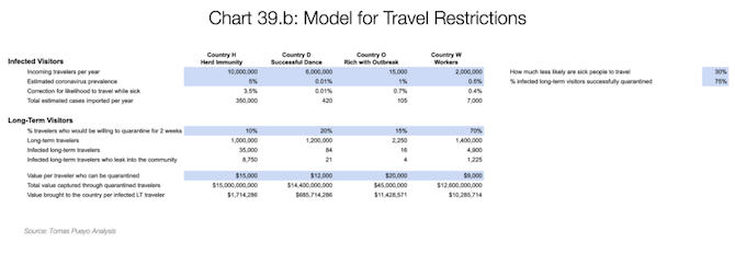 - Los dos factores clave aquí son la prevalencia del coronavirus (proporción de la población infectada) del país de origen y el éxito en la identificación y el aislamiento de casos. Después de eso, viene el beneficio por visitante o turista.