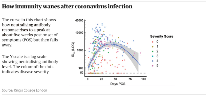 Los análisis de sangre revelaron que mientras el 60% de las personas obtuvieron una respuesta de anticuerpos «potente» en el punto álgido de su batalla contra el virus, solo el 17% retuvo la misma potencia tres meses después. Los niveles de anticuerpos cayeron hasta 23 veces durante el período. En algunos casos, se volvieron indetectables.