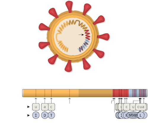 Línea superior cambio en bases de la secuencia de ARN. Línea inferior cambio en aminoácidos