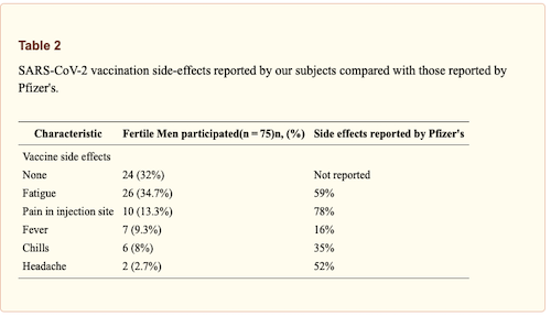 “Impulsadas por las observaciones antes mencionadas de los parámetros anormales del semen después de la infección por SARS-CoV2, las afirmaciones infundadas en los medios de comunicación populares insinuaron una posible correlación entre la vacuna contra el SARS-CoV-2 y la posible infertilidad masculina. En este estudio prospectivo, nuestro objetivo fue investigar el efecto de la vacuna BNT162b2 SARS-CoV-2 en los parámetros de análisis de semen de machos fértiles. Nuestra hipótesis inicial fue que la vacuna no provocará un efecto adverso sobre los parámetros del semen. Esta suposición se basó en gran medida en el perfil de seguridad relativamente favorable de la vacuna, con solo el 16% de los sujetos informados por Pfizer que experimentaron fiebre leve a moderada después de la segunda dosis. (Polack et al., 2020).”