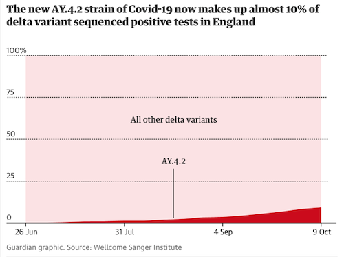 Tanto el Dr. Jeffrey Barrett, director de la Iniciativa de Genómica Covid-19 en el Instituto Wellcome Sanger en Cambridge, como el profesor Francois Balloux, director del Instituto de Genética del University College de Londres, han sugerido que la AY.4.2 podría ser 10 -15% más transmisible que la variante Delta original.