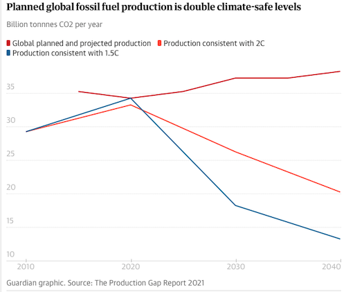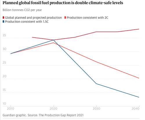 A pesar de las innumerables promesas de muchas naciones, los gobiernos aún no tienen planes para reducir la producción de combustibles fósiles, según el informe citado anteriormente. La brecha entre la extracción planificada de carbón, petróleo y gas y los límites de seguridad sigue siendo tan grande como en 2019, cuando la ONU informó por primera vez sobre el tema.