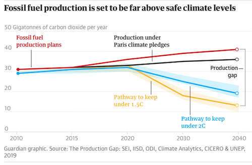 El informe, elaborado por el Programa de las Naciones Unidas para el Medio Ambiente (Unep) y otros investigadores, describe como la producción mundial de petróleo y gas aumentará en las próximas dos décadas, y se prevé que la producción de carbón disminuya ligeramente. Esto da como resultado el doble de la producción de combustibles fósiles en 2030, lo que es consistente con alcanzar el aumento de 1.5 ° C.