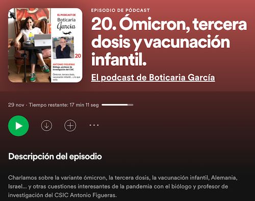 Omicron, tercera dosis y vacunación infantil. Podcast Boticaria García. Enlace a Spotify.