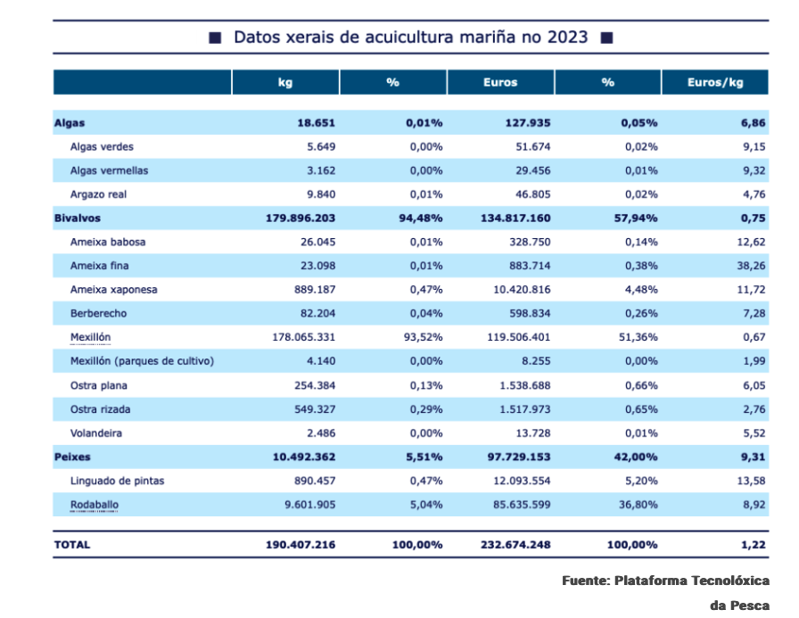 A pesar de la crisis, el mejillón sigue liderando la acuicultura española, pero otros cultivos siguen creciendo. En 2023, la producción de lubina alcanzó las 24.580 toneladas, con un valor de mercado cercano a los 203 millones de euros, superando al mejillón en términos de ingresos.