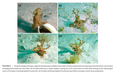 En dos ocasiones, cuando abandonaron sus refugios, los pulpos usaron un movimiento sorprendente: locomoción bípeda. Antes de caminar, adoptaban una postura característica, enrollando y levantando dos brazos frontales sobre su cabeza mientras se apoyaban en los otros seis. Luego se desplazaban pegados al fondo, utilizando solo dos brazos para caminar de forma sigilosa, sin romper el camuflaje. Esta forma de moverse, lenta y controlada, les permitía cruzar espacios abiertos sin despertar sospechas.