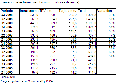 Según el último informe publicado por la CMT (pdf), el comercio electrónico creció en el tercer trimestre de 2008 un 33% respecto al mismo trimestre del año anterior. Aunque sea el menor crecimiento de los registrados en los últimos años (ver tabla) y dé lugar a comentarios pesimistas, es un buen dato si se compara con lo que está ocurriendo en el exterior.