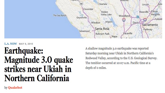 Quakebot fue diseñado por Schwencke para recopilar datos de interés periodístico de alertas publicadas por el Servicio Geológico de los Estados Unidos (USGS), introduciéndolos a una plantilla noticiosa escrita con anterioridad. La nota preliminar se guarda en el sistema de manejo de contenido del periódico mientras se envía una alerta por correo a un editor humano, quien revisará la nota y decidirá si la publica en línea o no. Cuando Quakebot recibió una alerta del USGS señalando un terremoto de magnitud 3.0 o mayor (algo menor no causaría mucho impacto) a las 6:25 a.m., hora del Pacífico, mandó un correo a Schwencke quien publicó la nota pocos minutos después, asegurando que Los Angeles Times fuera el primer periódico en reportar la noticia. Y esto es sólo el principio…