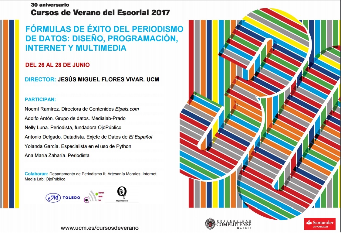 Pero, el periodismo de datos es inter y multidisciplinar. Y este es el enfoque que tendrá el curso «Fórmulas de éxito del periodismo de datos. Diseño, programación, Internet y multimedia» que se realizará del 26 al 28 de junio de 2017, en la sede de @CursosVeranoUCM en El Escorial (Madrid). En España y Latinoamérica, algunos medios de reconocida trayectoria y digitales emergentes así como universidades e instituciones afines a la innovación, vienen haciéndose eco del periodismo de datos y su tratamiento en los distintos soportes multimedia y plataformas de Internet y móviles. Destacamos las iniciativas del diario El País, RTVE o El Confidencial (que participaron en el curso de verano de 2015), Medialab Prado u Ojo Público (de Perú) cuyas participaciones se realizarán en la edición de 2017. Este curso pretende mostrar el statu quo del periodismo de datos, el tratamiento de los datos masivos y la transparencia institucional en España así como las herramientas y recursos multimedia, motivo por el cual es ya habitual traer a los cursos de El Escorial a renombrados especialistas de ámbito nacional e internacional que desarrollan esta disciplina en las organizaciones informativas.
