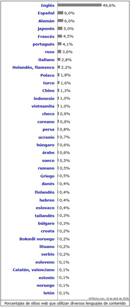 Según el sitio W3Techs, una empresa de estudios tecnológicos que publica estadísticas de uso de los idiomas de contenido para sitios web, el inglés es utilizado por el 49,6% de todos los sitios web cuyo idioma de contenido conocemos. Pero, el español, se posiciona en segundo lugar, con un 6,0%. Para Infobae, aunque el uso de la IA se ha disparado en Occidente, gran parte del resto del mundo ha quedado al margen de la conversación, pues la mayor parte de la tecnología se entrena en inglés. A los expertos en IA les preocupa que la brecha lingüística pueda exacerbar las desigualdades tecnológicas y que deje atrás a muchas regiones y culturas.