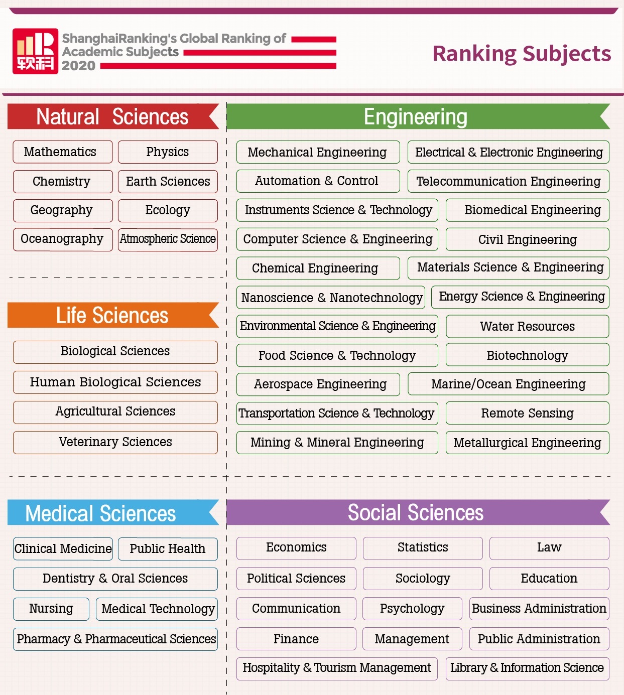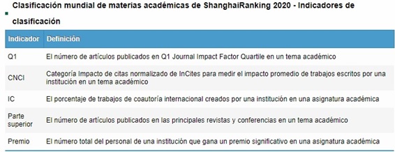 Las clasificaciones por materias del Ranking mantienen el uso de una metodología transparente y datos de terceros. Los indicadores de clasificación incluyen medidas de calidad de la investigación, grado de colaboración internacional, investigación con la más alta calidad y los más altos reconocimientos académicos. El premio académico es un indicador destacado de las clasificaciones globales de Ranking de Shanghai. En la clasisficacion de 2020, se han utilizado 30 premios de profesores de las 100 mejores universidades del mundo identificados a través de la Encuesta de Excelencia Académica, que cubren 25 asignaturas clasificadas. La Encuesta de Excelencia Académica también genera 151 revistas principales con alto índice de impacto en 47 materias, y 22 conferencias académicas principales (alta indexación) en Informática e Ingeniería.