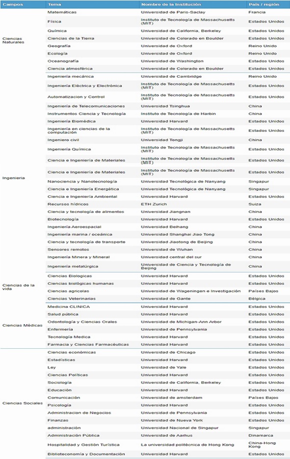 Las universidades número uno clasificadas en cada materia se muestran en la siguiente tabla.En esta clasificación, las universidades estadounidenses ocupan los primeros puestos en 31 asignaturas y las universidades chinas en 11 asignaturas. La universidad de Harvard obtiene la mejor puntuación (con 14 coronas), 5 de las cuales son de ciencias sociales, 4 de ciencias médicas, 3 de ingeniería y 2 de ciencias de la vida. El Instituto Tecnológico de Massachusetts (MIT) encabeza la lista con 6 asignaturas, 5 de las cuales son de ingeniería. Otras universidades que encabezan con más de una clasificación de materias son: la Universidad de California Berkeley, la Universidad de Pennsylvania y la Universidad de Colorado (Boulder) Estados Unidos; la Universidad de Oxford del Reino Unido y la Universidad Tecnológica Nanyang de Singapur. La Universidad de París-Saclay encabeza la tabla de la asignatura de Matemáticas en su primera aparición en el Ranking de Shanghai.