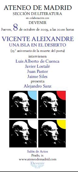 Con motivo del 25 aniversario del fallecimiento de Vicente Aleixandre, la sección de Literatura del Ateneo de Madrid, en colaboración con DEVENIR, organiza un acto de homenaje al poeta en el que intervendrán Luis Alberto de Cuenca, Javier Lostalé, Juan Pastor, Jaime Siles y Alejandro Sanz.