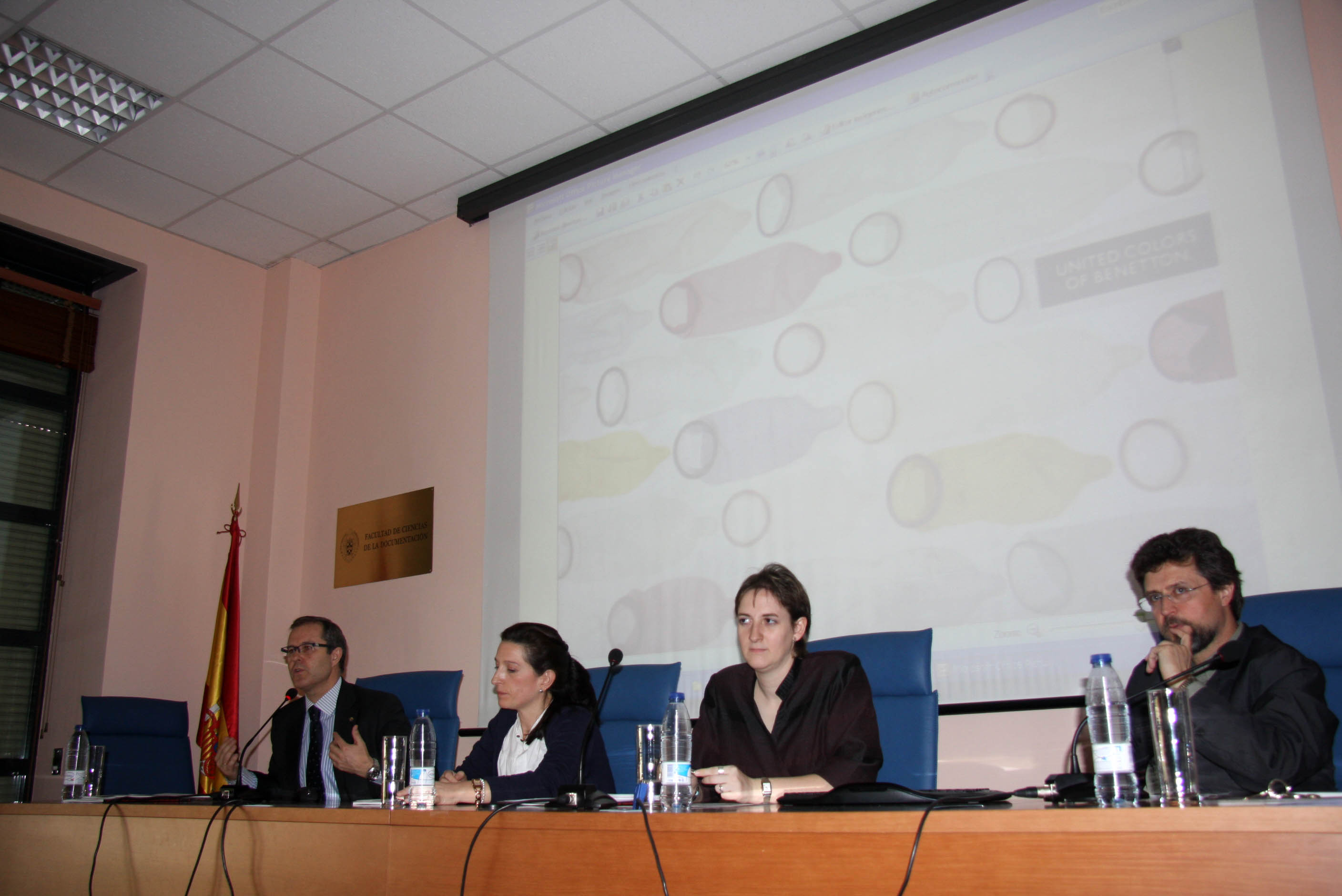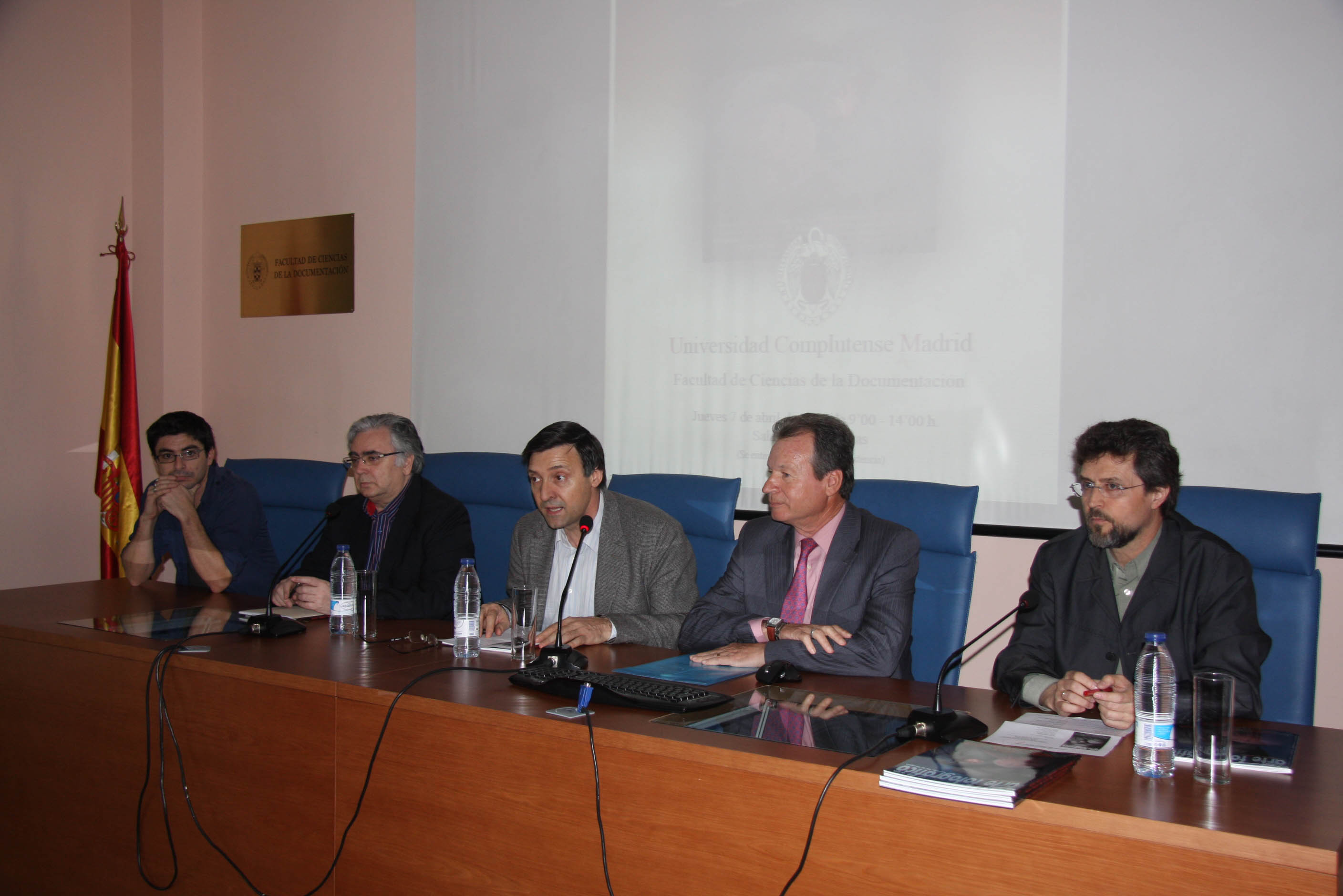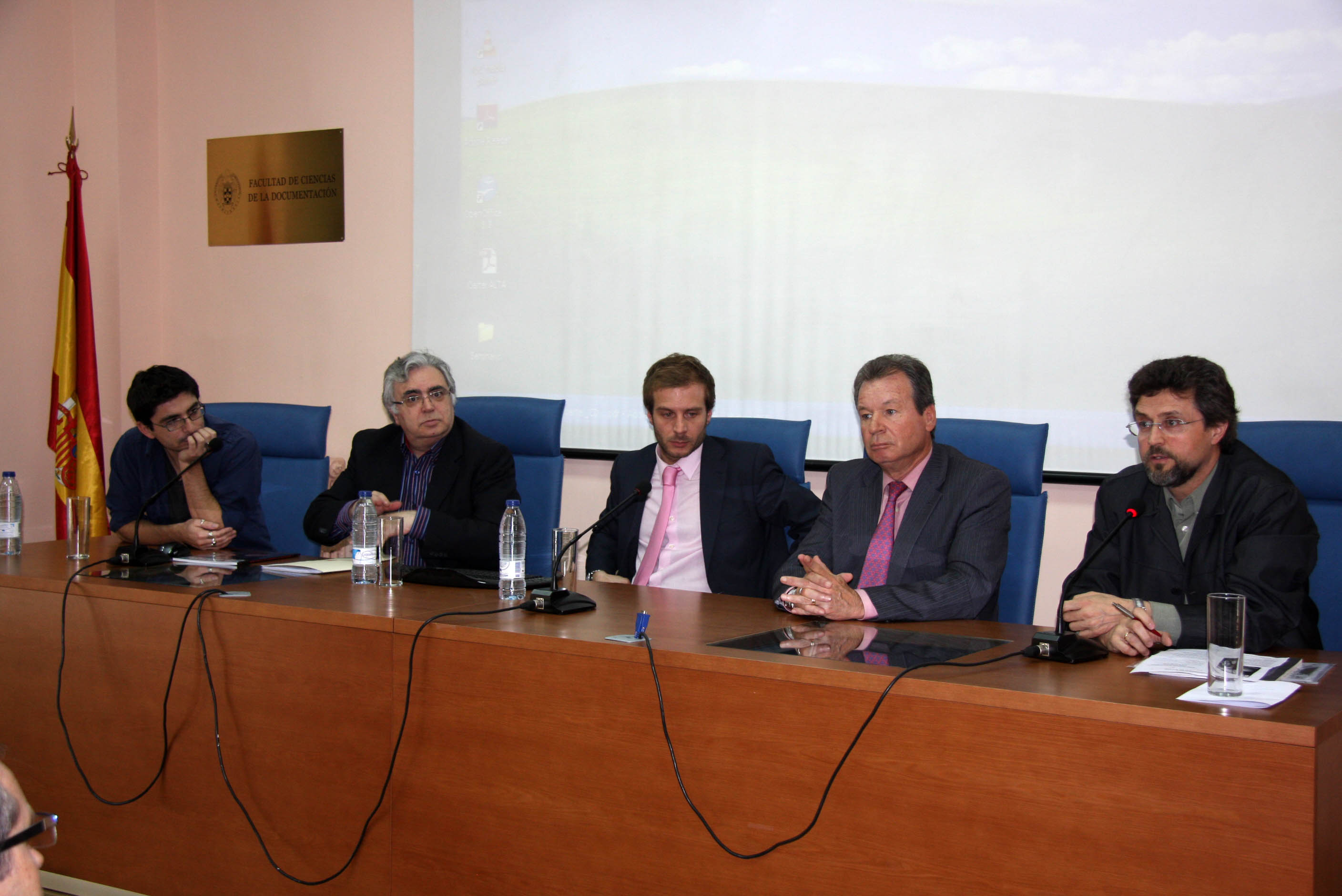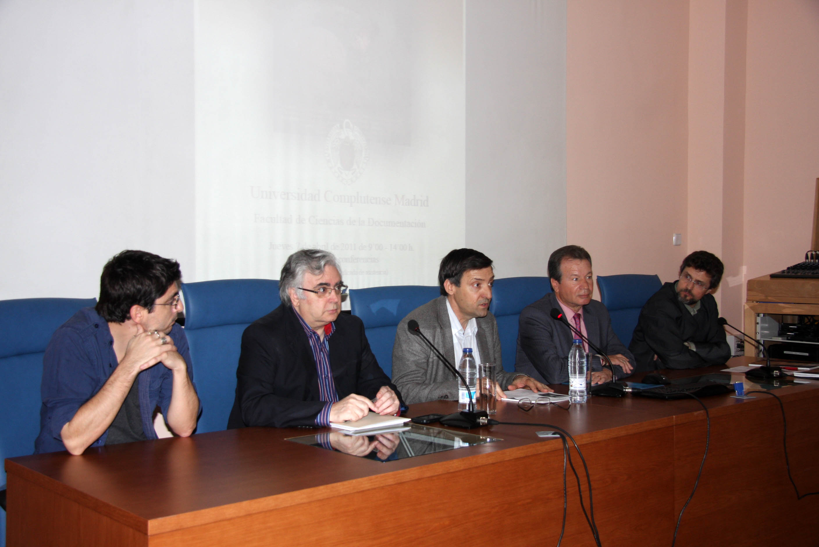 Los conferenciates con el decano de la Facultad de CC. Documentación