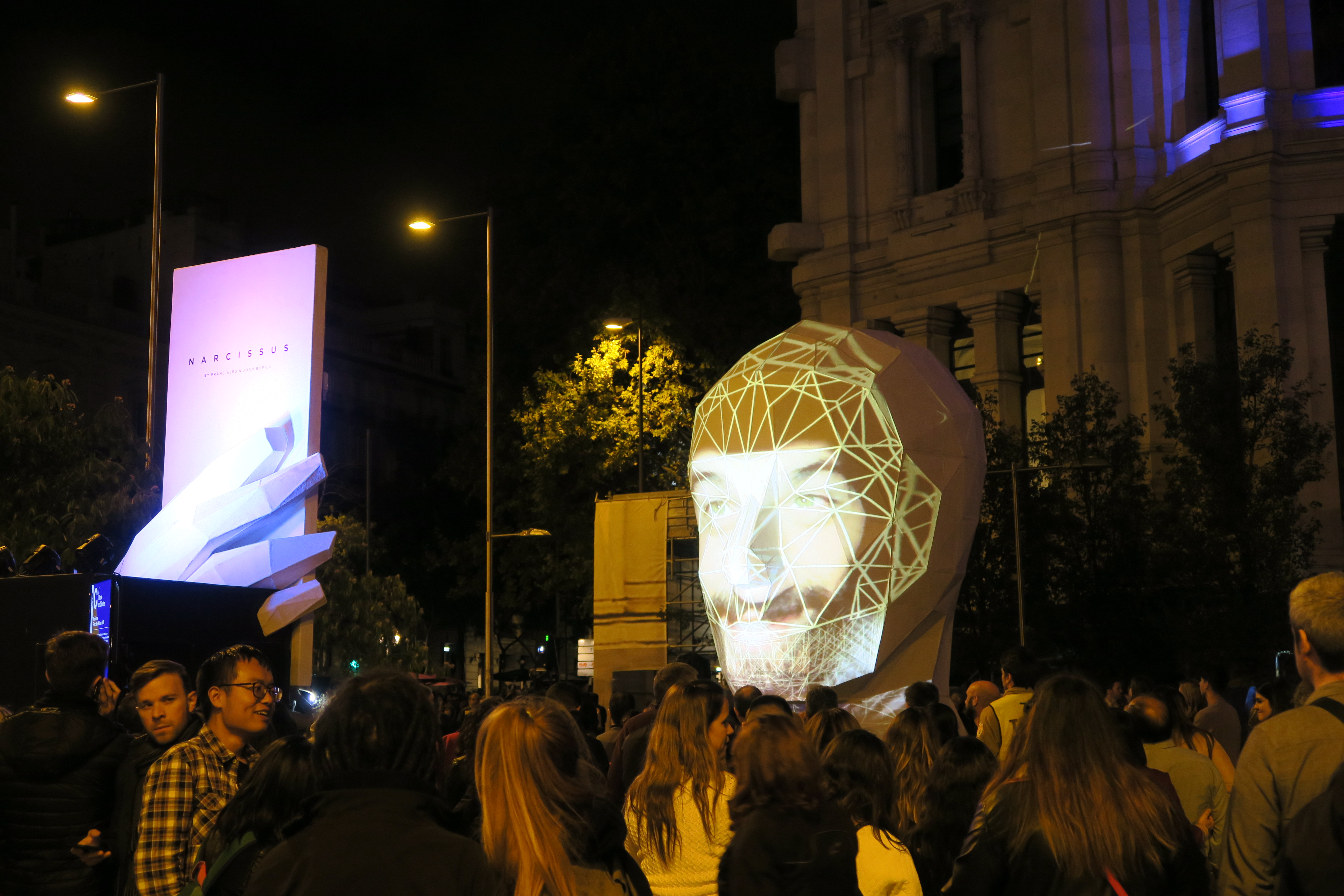 En la Puerta de Alcalá, tres audiovisuales que la convertían en un gran lienzo. Las fuentes de Cibeles, Nepturno y Apolo se llenaron con más de 60.000 botellas de plástico recicladas, para concienciarnos del uso masivo de ese producto. Junto al Ayuntamiento, una gran cabeza proyectaba en tiempo real la cara de las personas que paseaban por allí