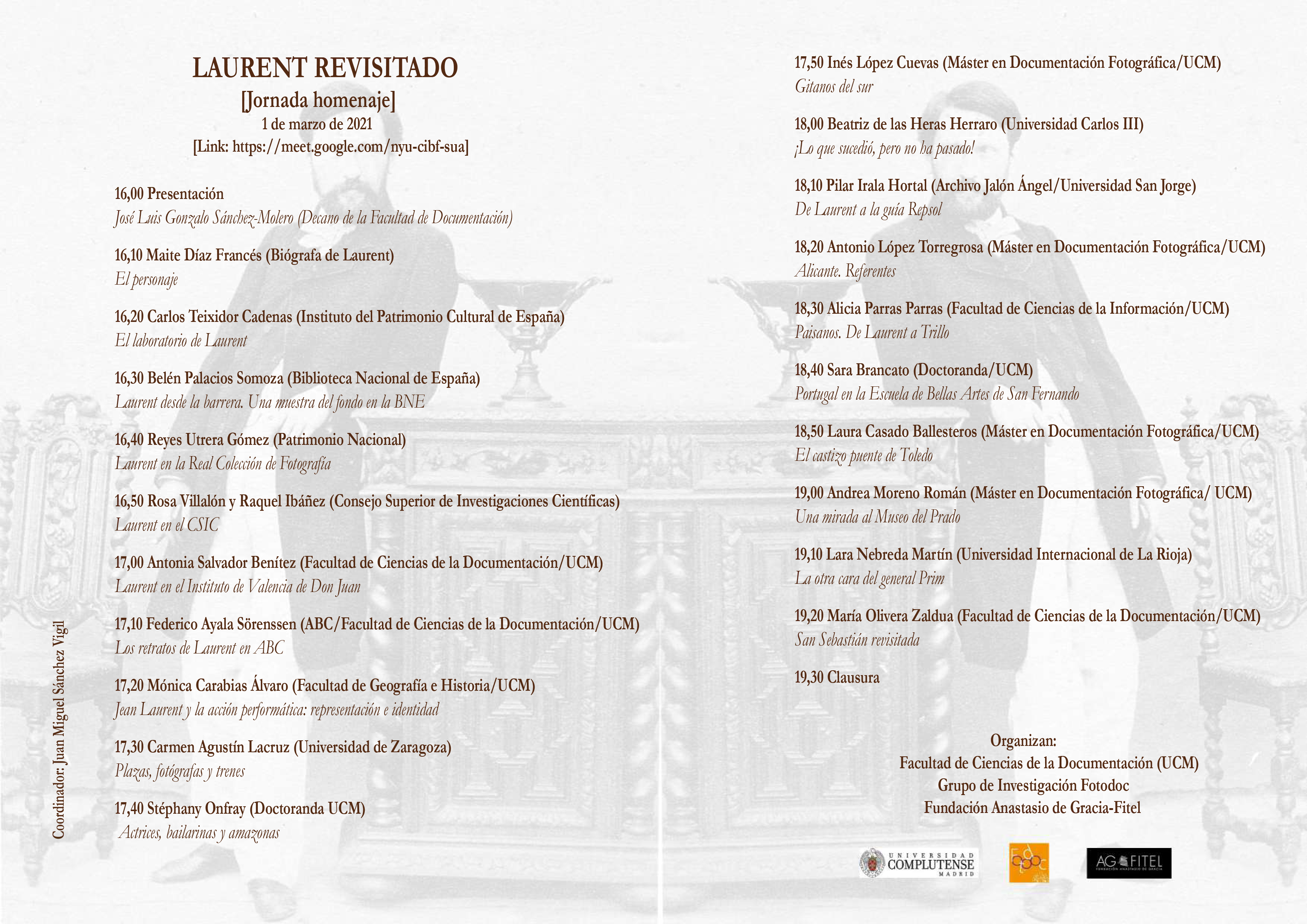Organizada por la Facultad de Ciencias de la Documentación de la UCM, el Grupo de Investigación Fotodoc y la Fundación Anastasio de Gracia-Fitel y con la participación del Instituto del Patrimonio Cultural de España, el Consejo Superior de Investigaciones Científicas, Patrimonio Nacional, Biblioteca Nacional, ABC, la Universidad de Zaragoza, la Universidad Carlos III, la Universidad San Jorge, la biógrafa de Laurent, doctorando y masterandos de la UCM entre otros.