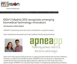 El proyecto ganador de la segunda edición de IDEA2 Madrid es  ‘APNEAPP: popularizing automatic severe OSA detection via speech analysis’, una aplicación para dispositivos móviles destinada a detectar de forma automática si un individuo está experimentando un episodio de apnea obstructiva del sueño. Madrid (ver noticia resumen en la web del Consorcio M+Visión)