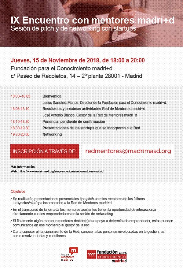 El próximo 15 de noviembre de 2018, de 18:00 a 20:00h tendrá lugar en la sede de la Fundación para el Conocimiento madri+d un nuevo encuentro entre mentores y emprendedores con la presentación de un grupo de startups tecnológicas que se incorporan a la Red de Mentores madri+d.