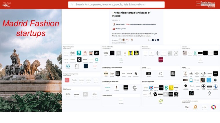 Los landscapes o mapas sectoriales permiten a los Knowledge Partners de Startup Radar organizar, clasificar y filtrar las más de 3200 startups en activo de la Comunidad de Madrid. En esta ocasión, el landscape de las empresas innovadoras en el sector de la moda y del retail madrileño ha sido elaborado por David Luquín, experto y asesor de innovación y transformación digital en empresas de moda y retail. En él, ha identificado más de cien empresas innovando en el sector de Moda, que tienen sede o han sido fundadas en la Comunidad de Madrid y, posteriormente, las ha segmentado en las siguientes clasificaciones: Digital Marketplace, Marketplaces for second hand, Footwear, Renting and Leasing Services, Trading Platforms, Accesories, Brands, Eyewear, Luxury, Fast Tech for retail, Fabrics and Textiles, Services for fashion companies y Ethically Made & Sustainable Brands. En definitiva, un mapa sectorial que nos entrega una visión muy útil y clara, realizado a partir de los datos de la plataforma del ecosistema Startup Radar madri+d en Dealroom, donde, además, se puede acceder a datos más amplios de cada empresa; como pueden ser, entre otros, los datos de fundación, indicadores de crecimiento o tráfico, las rondas de financiación, los empleos creados o las valoraciones de las empresas.