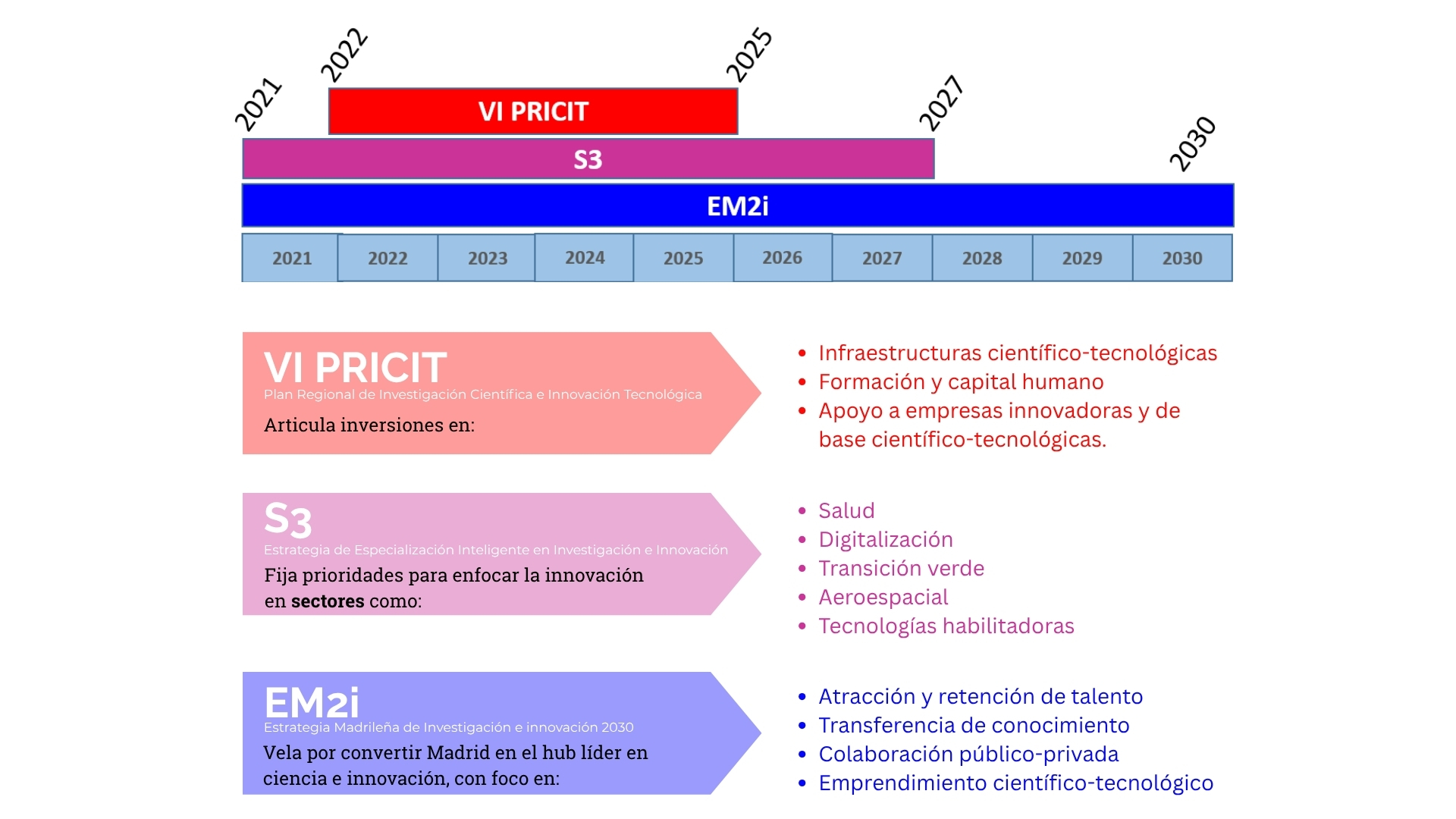 Este posicionamiento no es casualidad. La Comunidad de Madrid lleva años desarrollando políticas coordinadas bajo la Estrategia Madrileña de Investigación e Innovación 2030 (EM2i), que se resumen en el siguiente gráfico: