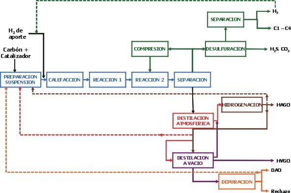 La hidrogenación del carbón tiene como objetivo adicionar hidrógeno a la estructura del carbón, rompiéndola en la mayor extensión posible para obtener líquidos que sean destilables. Los primeros intentos realizados por Bergius a principios del siglo pasado se basaron en preparar una suspensión del carbón en aceites pesados, donde se disolvía parcialmente, y aplicar altas temperaturas y presiones con el objetivo de craquear la estructura del carbón. Posteriores mejoras consistieron en la introducción de un catalizador (óxido de hierro, níquel-molibdeno o cobalto-molibdeno sobre alúmina) y de hidrógeno que moderaron las condiciones a aplicar, pasando de 900 a 400-450 ºC y de 1.000 a 150-200 bar.