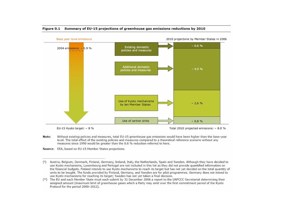 La proyección realizada se basa en las cifras de varios estados miembros que aseguran que reducirán sus emisiones más allá de lo requerido para cumplir sus objetivos nacionales. Las políticas y medidas nacionales en vigor reducirán el total de emisiones de la UE-15 a un 0,6% por debajo de los niveles de 1990. Otras medidas, planificadas pero aún no implementadas, aumentarán dicha reducción a un 4,6%. La utilización esperada de los mecanismos de Kyoto por parte de 10 de los 15 países reducirá dichas emisiones en un 2,6% adicional, a un coste de 2.830 millones de euros. Finalmente, el uso de sumideros de carbono, como la plantación de bosques para absorber CO2, contribuirá con un 0,8% adicional. Los 10 nuevos estados miembros de la UE están encaminados a alcanzar sus objetivos de Kyoto individuales, a pesar de que aumenten sus emisiones. Ello se debe principalmente a las restructuraciones económicas de los 90.