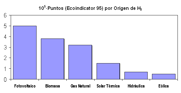 En esta figura se atribuye a la energía solar fotovoltaica o a la biomasa el mayor impacto por unidad de energía procedente de hidrógeno, mientras que la obtención por combustible fósil, gas natural, produce mucho menor impacto. Este tipo de estudios debe hacernos recordar que, si bien se trata de que el Análisis de Ciclo de Vida sea una herramienta objetiva, a veces los resultados dependen esencialmente de las suposiciones iniciales. En este caso, se esta cometiendo un error en las hipótesis iniciales, pues se ha considerado un tiempo de vida de cada panel solar excesivamente corto (menor de 200 horas de sol), lo que conduce a los resultados de