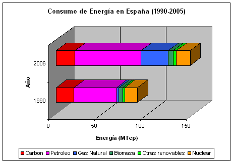 La figura muestra la comparación del consumo de energía anual en España (en Millones de Toneladas equivalentes de petróleo), en 1990 y 2005, como se observa la reducción de emisiones es debida fundamentalmente a la sustitución del carbón (que en 1990 suponía el 22% del total de energía primaria consumida en España por Gas Natural que pasó de un 2.5% en