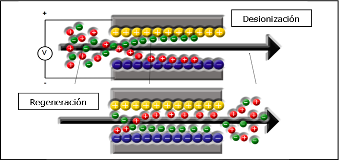 La desionización capacitiva se presenta como una alternativa tecnológica a la ósmosis inversa por ser un procedimiento de baja presión y que no necesita utilizar membranas, que son probablemente las dos mayores limitaciones de la ósmosis inversa. El esquema básico de funcionamiento de este proceso se muestra en la Figura. Durante la etapa de desionización, se aplica una carga eléctrica externa sobre un par de electrodos sumergidos en el agua a tratar, lo que hace que los iones disueltos en el agua se desplacen hacia el electrodo signo contrario, donde quedan adsorbidos. En la etapa de regeneración, se corta la alimentación eléctrica a los electrodos con lo que los iones retenidos quedan liberados. Si durante este proceso los electrodos se conectan a un circuito eléctrico externo, se produce una corriente eléctrica, del mismo modo que sucede durante la descarga de un condensador.