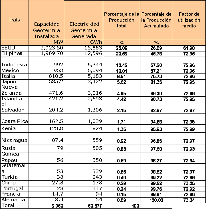 Los países con mayor potencia instalada son: EEUU con 2923 MW instalados, Filipinas con 1969 MW, Indonesia y Méjico con 950 MW , Italia con 810 y Japón 535 MW, entre los 6 generan el 80% de la energía geotérmica mundial.
