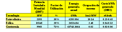 Para calcular la energía anual generada por cada tecnología, hay que tener en cuenta el número de horas de funcionamiento anual, para que lo que debe utilizar el factor de utilización (% de horas que la planta funciona), así la fotovoltaica funciona únicamente durante las horas de sol (aproximadamente 8 horas al día y factor de utilización entorno al 30%), la eólica siempre y cuando la velocidad del viento se encuentre dentro de unos valores mínimos y máximos (factor de utilización medio anual del 20%). Por el contrario la geotermia es la única renovable que está disponible las 24 horas al día, (se considera un factor de utilización del 73%).