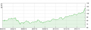 Evolución en el último año del precio de barril de Brent en $ (Fuente: WFG)