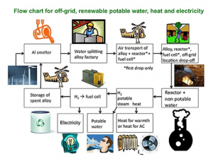 Esta tecnología podría ser utilizada para abastecer de agua potable y de energía a los pueblos y también para las operaciones militares. La aleación contiene aluminio, galio, indio y estaño. La inmersión de la aleación en agua dulce o agua salada provoca una reacción espontánea de ruptura de la molécula de agua generando hidrógeno y oxígeno. El hidrógeno podría almacenarse en una pila de combustible para proporcionar electricidad y se podría producir agua limpia, en forma de vapor de agua, como un subproducto. El vapor de agua que se genera mata a las bacterias, pudiendo condensarse y generar agua limpia a partir de aguas residuales, de aguas saladas o sucias, de manera, que puede utilizarse como un método de desalinización del agua marina, o de depuración de aguas no potables. Además puede tener diversos usos potenciales como se muestra en el diagrama siguiente: