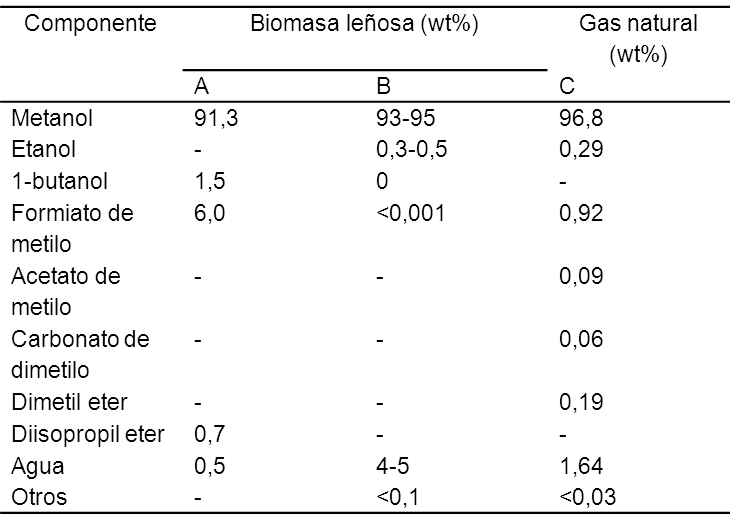 Las impurezas que se encuentran en mayor proporción en el biometanol obtenido a partir de biomasa, como se muestra en la Tabla 1, son etanol, 1-butanol, formiato de metilo y diisopropil éter. Los estudios realizados con cada una de estas impurezas muestran cómo afectan al comportamiento del dispositivo en diferentes concentraciones. Es importante valorar cada una de las impurezas por separado, conociendo así el nivel de relevancia que tiene en la pérdida de eficiencia de la pila de combustible, llegando así a un compromiso entre la composición más favorable del combustible y la más económica del proceso de obtención del biometanol a partir de la biomasa. Con estos estudios se llega a valorar como las impurezas de formiato de metilo no afectan al rendimiento del dispositivo, incluso en altas concentraciones, mientras otra impureza como el 1-butanol, en concentraciones de 1000 ppm, produce degradaciones muy fuertes en la pila de combustible con pérdidas de eficiencia mayores al 60% [1]. El proceso de obtención de metanol a partir de gas natural presenta una mayor tanto por ciento de metanol, aunque a su vez contiene otras impurezas como el acetato de metilo, el carbonato de metilo y el dimetil éter. A su vez, la cantidad de etanol es similar a la que se obtiene por un proceso a partir de biomasa y no presenta 1-butanol ni Diisopropil éter.