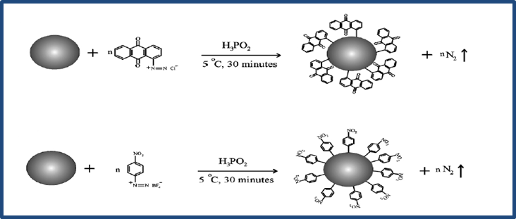 De entre estos métodos, la electro-reducción de sales de diazonio1 destacó especialmente en la modificación de carbones, y estudios posteriores llevaron al desarrollo en el grupo de Richard Compton de un método químico para la reducción homogénea de sales de diazonio usando ácido hipofosforoso, lo que constituyó la primera metodología química sencilla para la derivatización de carbones (Fig. 1).2