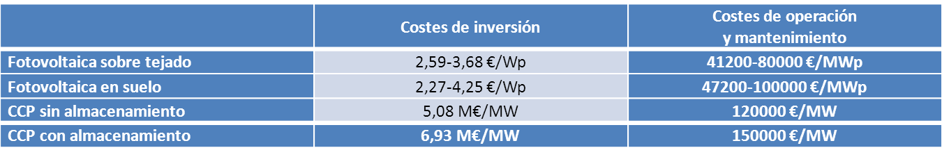 Tabla 1. Análisis de costes para fotovoltaica y termoeléctrica. Fuente: IDAE