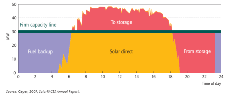 – Los Sistemas Solares Termoeléctricos admiten el acoplamiento de un sistema de almacenamiento térmico para almacenar el excedente de energía que se genera en los momentos de máxima radiación, y emplearlo después cuando la radiación solar es baja o nula. Esto permite generar de forma continua, atenuando en gran medida la intermitencia del recurso solar. Las plantas Fotovoltaicas podrían también almacenar parte de la energía eléctrica mediante el uso de baterías, pero el almacenamiento en baterías es más complejo y mucho menos eficiente.